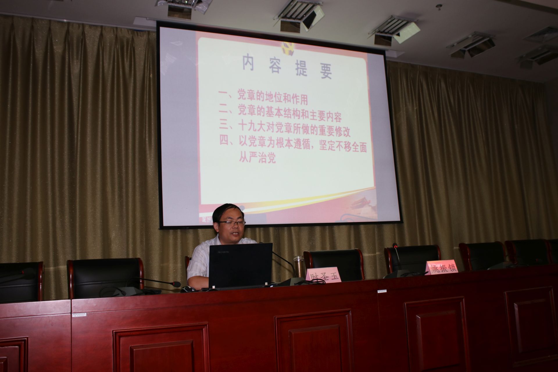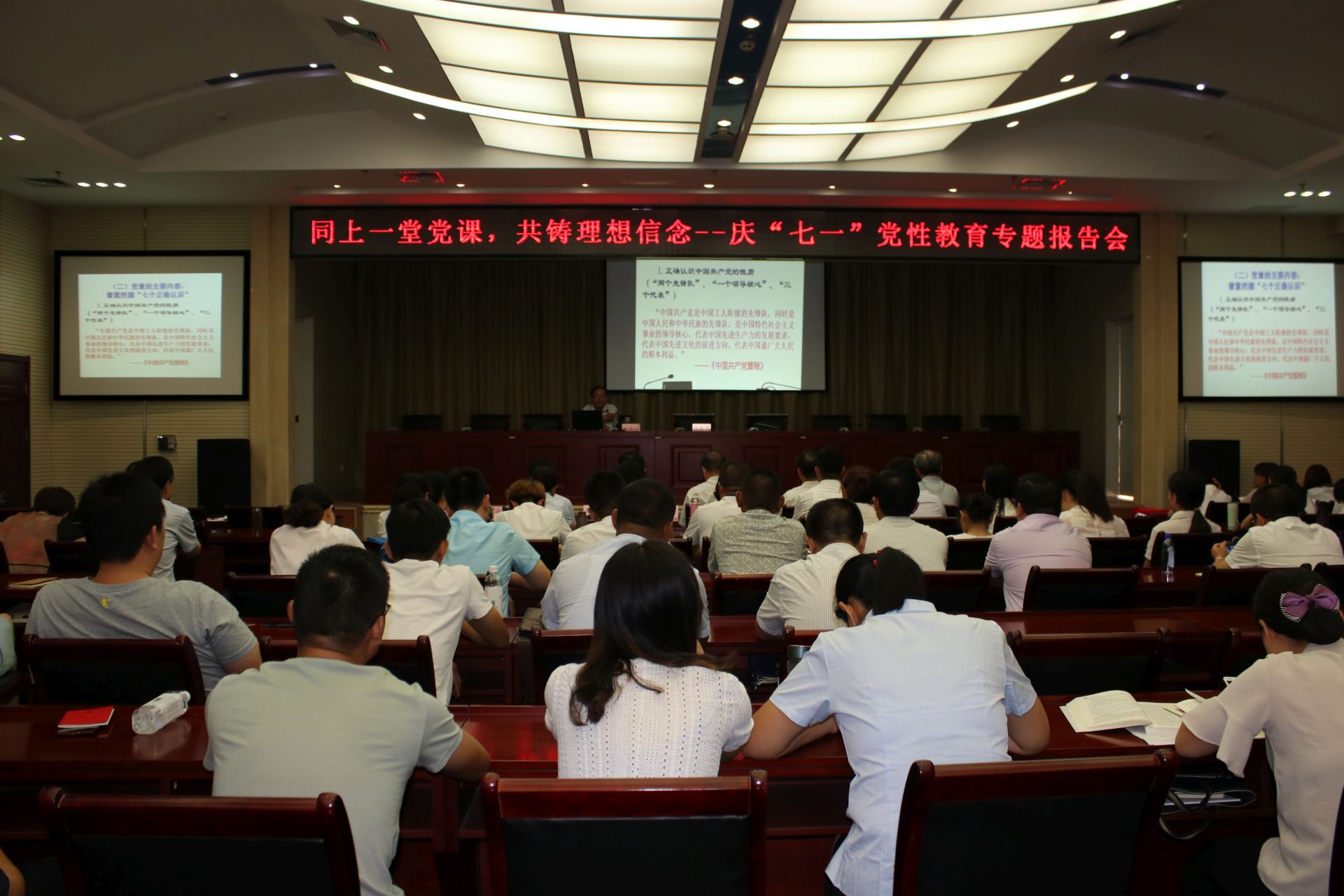 时圣玉教授做了题为《认真学习党章,严格遵守党章,做新时代合格党员》的辅导报告,共讲了四个方面:一是党章的地位和作用;二是党章的基本结构和主要内容;三是十九大对党章所做的重要修改;四是以党章为根本遵循,坚定不移全面从严治党。报告高屋建瓴,深入浅出,有很强的针对性,对在座的各位党员、基层干部学历教育学员掌握党章知识,领会党章精髓有着直接的指导作用。会后,各位党员同志纷纷表示,在这样一个特殊日子,参加这样的学习报告会,特别有意义,有收获。