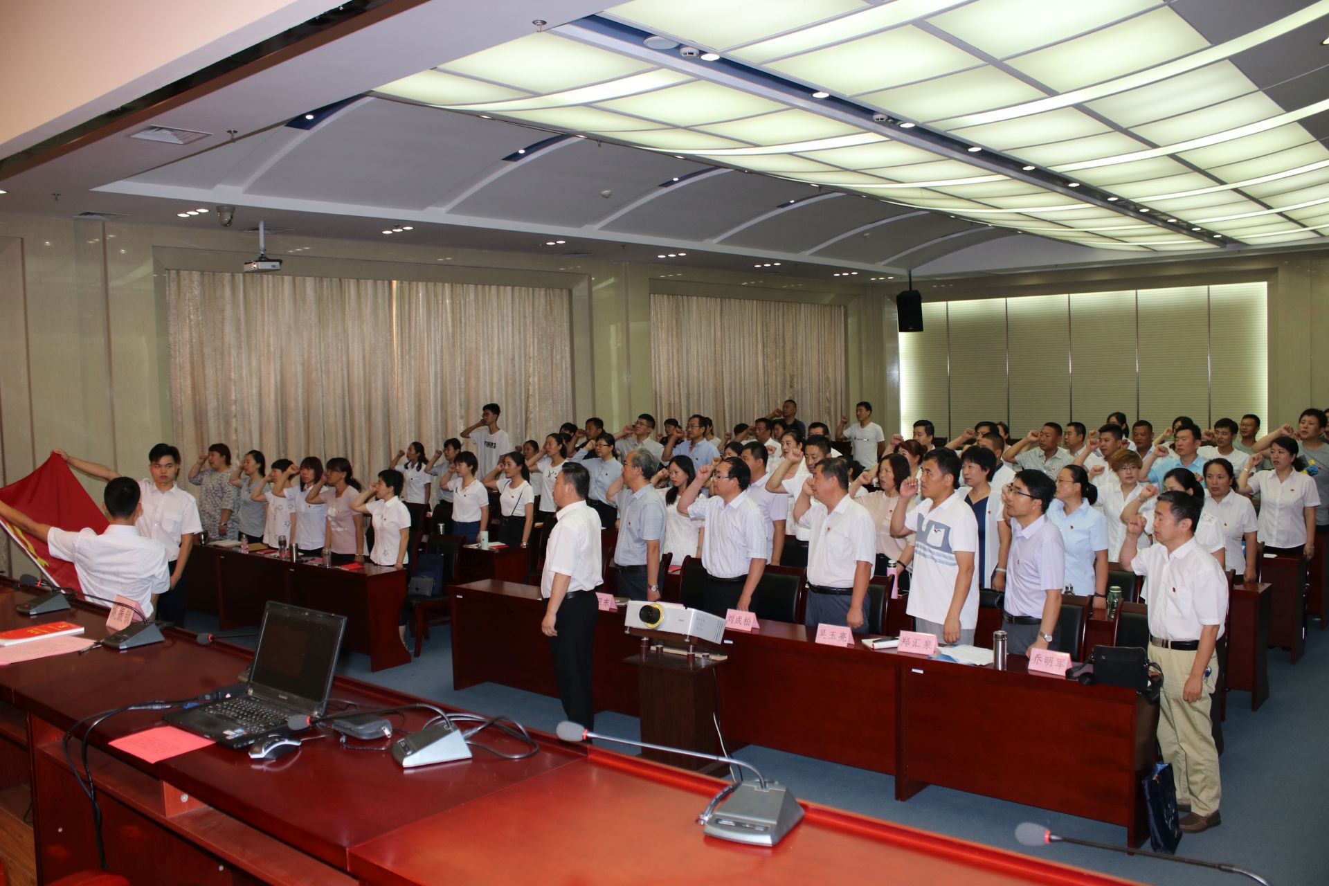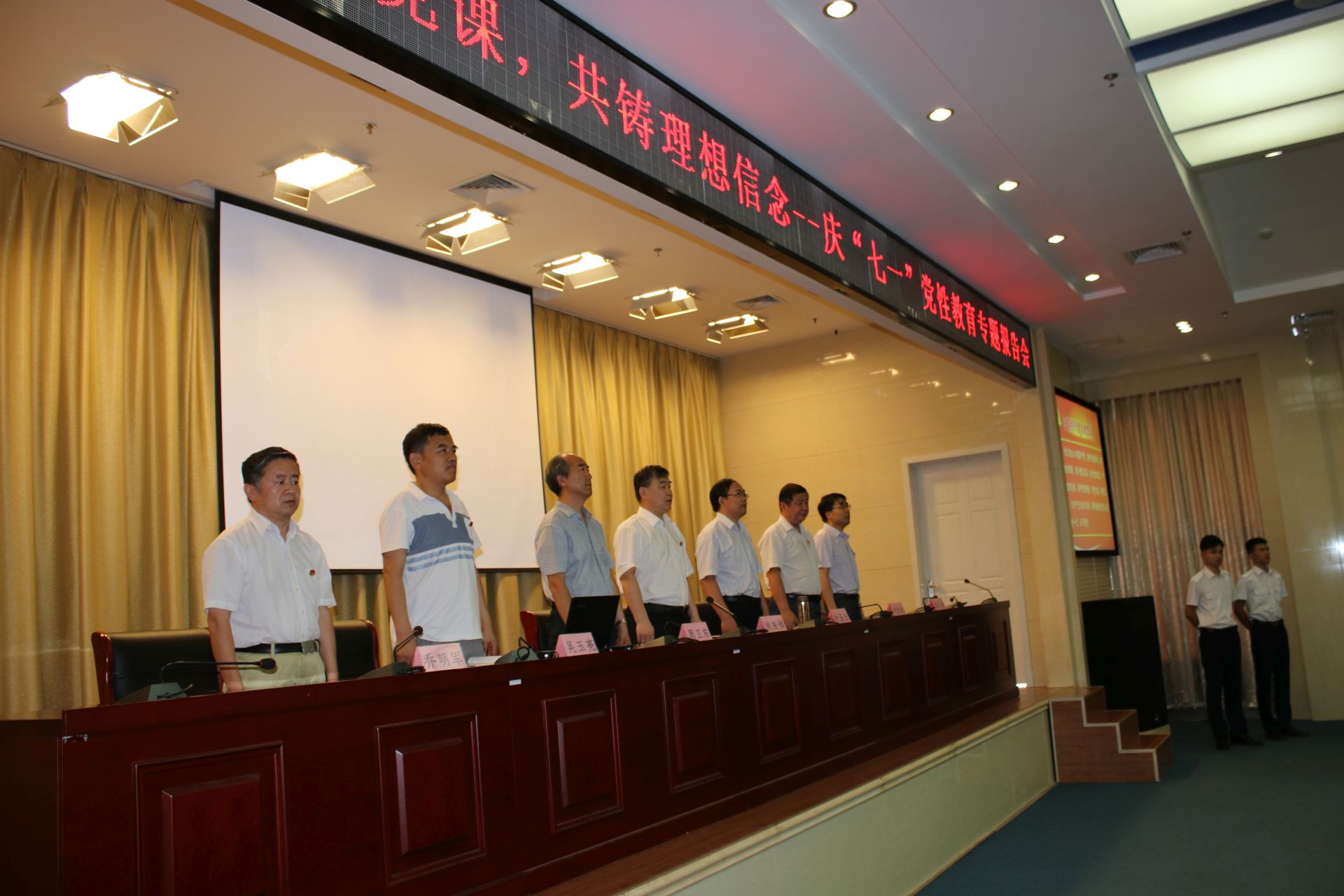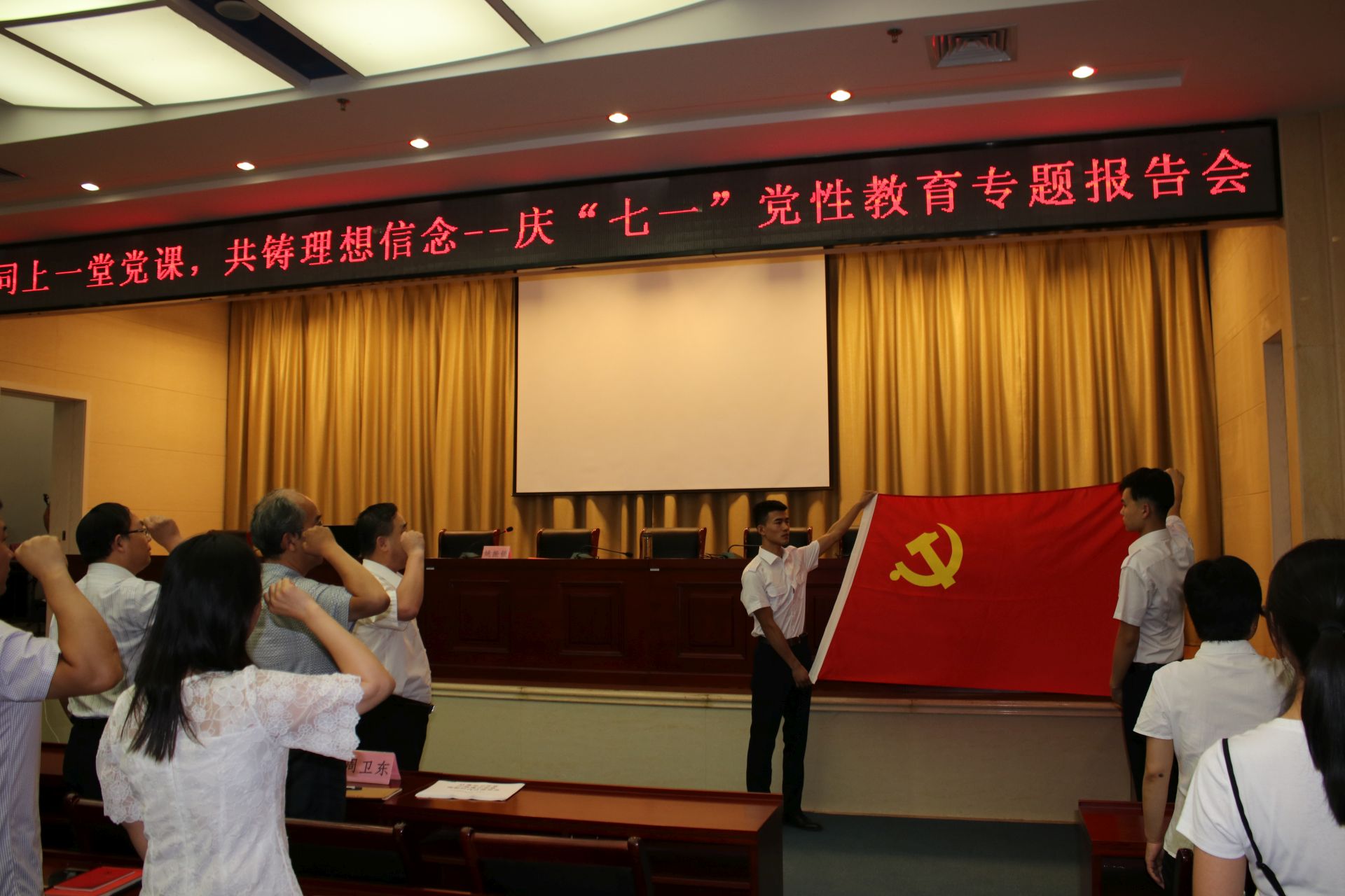 报告会在高亢嘹亮的国歌声中开始,在座的全体党员举起右臂,握紧拳头,面对党旗,重温入党誓词,“我志愿加入中国共产党,拥护党的纲领,……永不叛党。”铮铮誓言,发自肺腑,掷地有声,在报告厅萦绕回荡。