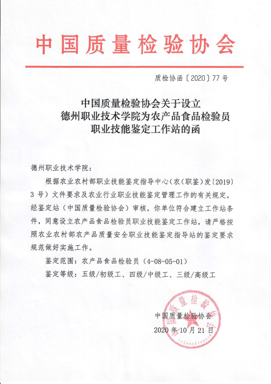 2020年10月21日,中国质量检验协会下发《中国质量检验协会关于设立米乐mile官方网站为农产品食品检验员职业技能鉴定工作站的函》(质检协函﹝2020)77号),米乐mile官网成功获批中国质量检验协会农产品食品检验员鉴定站资质!