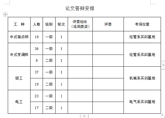 4、各系每工种各准备答辩室、备考室1间,每工种安排三名答辩评委,提前张贴论文答辩室、备考室门号,每工种准备三个答辩评委席牌。