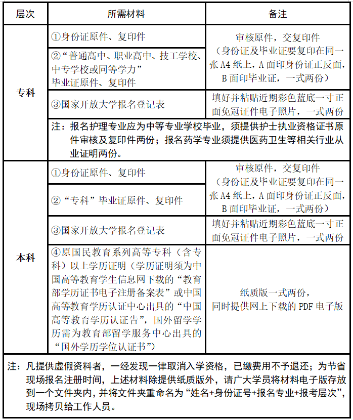 【查验证件】——【填写国家开放大学报名登记表(也可提前自行下载打印电子版填好)】——【在“国家开放大学统一身份认证平台”录入报名信息】——【打印报名信息表后本人核对签字确认】——【扫码采集新生照片】——【在线缴费(具体学费以山东开放大学开放教育在线缴费平台为准,届时如缴费系统不开放,缴费事宜则另行通知)】——【扫码加入新生微信群】